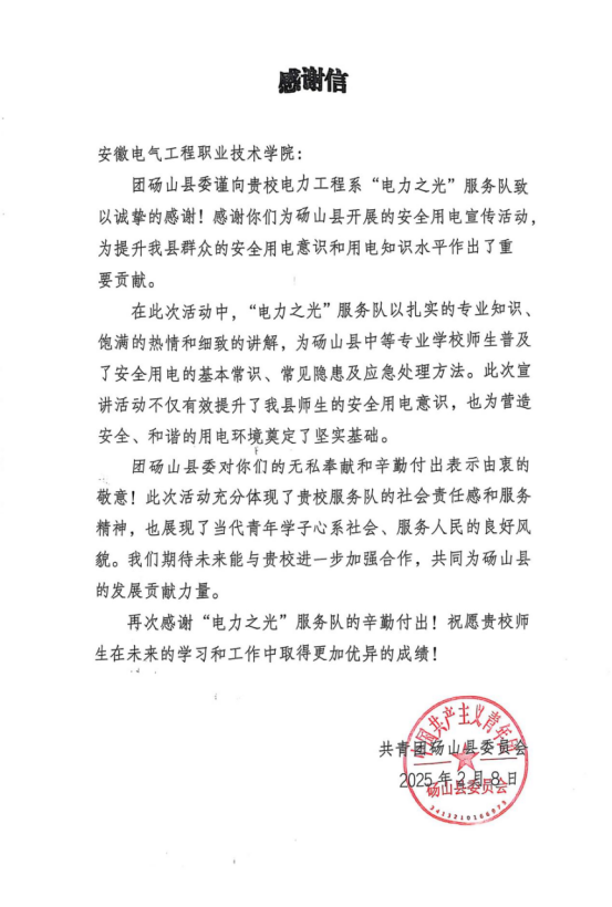 团砀山县委对学院“电力之光”服务活动发来感谢信