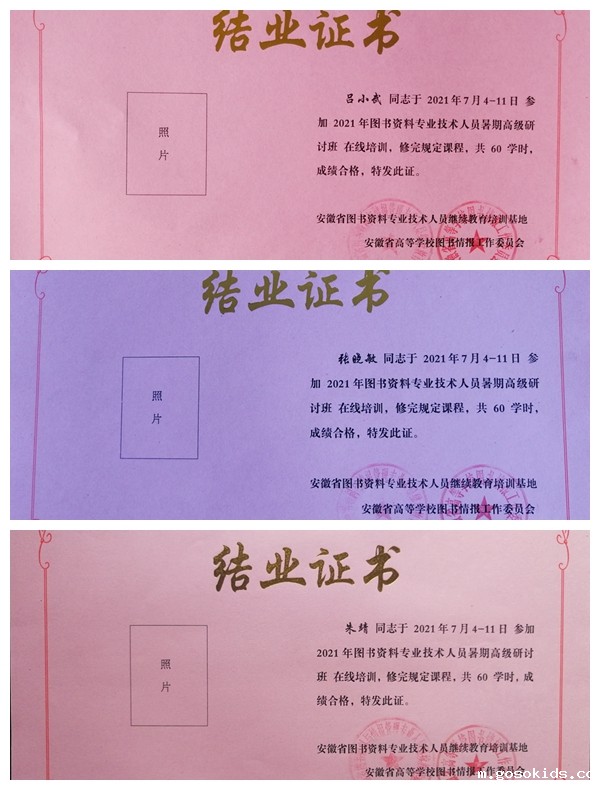 新学期伊始,图书馆全体馆员以崭新的精神面貌投入新学年新学期的工作中。暑期馆员一面进行图书资料整理和纸电一体化平台建设,一面进行业务培训。7月上旬,吕小武、朱靖、张晓敏三名馆员参加了由安徽省图书资料专业技术人员继续教育培训基地、安徽省高等学校图书情报工作委员会联合举办的“2021年图书资料专业技术人员暑期高级研讨班”在线培训。7至8月,汪邦银副馆长、朱靖老师先后参加了CALIS线上培训、中图学会线上培训、知网线上培训,均获得相关结业证书。